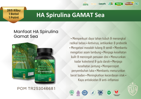 Ha spirulina gamat sea adalah kombinasi premium dari ekstrak spirulina (arthospira platensis) dan gamat emas (stichopus horrens). Suplemen ini dirancang khusus sebagai solusi alami untuk menjaga kesehatan tubuh secara menyeluruh, mulai dari perbaikan sel kulit hingga kekuatan tulang dan sendi.