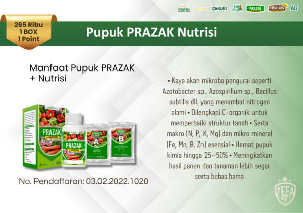 Pupuk prazak nutrisi adalah formula pupuk hayati yang dirancang khusus untuk meningkatkan kualitas tanah dan mengoptimalkan pertumbuhan tanaman. Dengan kandungan mikroba pengurai dan nutrisi makro-mikro yang lengkap, produk ini menjadi jawaban bagi petani yang menginginkan hasil panen melimpah dengan cara yang lebih efisien dan ramah lingkungan.